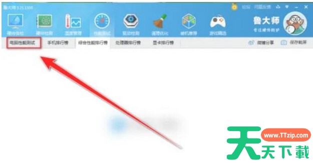 1、我们先把鲁大师这款软件打开,并且在鲁大师窗口中,点击【性能测试】。