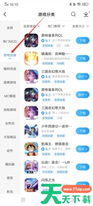 2、在游戏分类中,找到“游戏加速”分类,这里列出了可以加速的游戏。