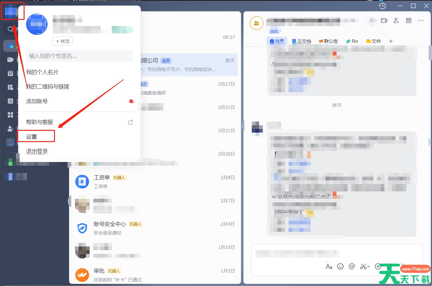 在桌面端点击头像,并点击设置 。