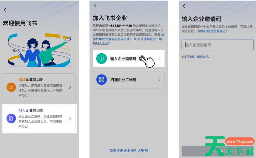 点击 加入企业或组织 > 输入企业邀请码,输入你收到的企业邀请码。