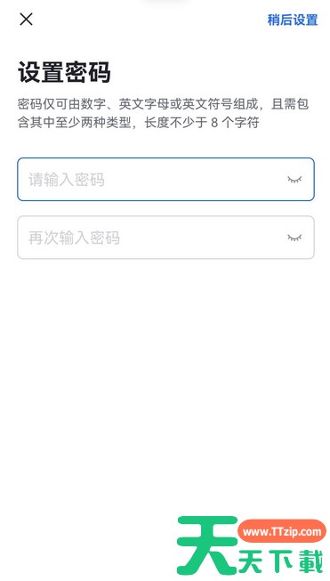 设置账号密码,点击 下一步,即可进入对应企业,在飞书与企业其他成员高效协作。你也可以点击 稍后设置,稍后设置密码不会影响你正常登录。登录后,如需设置密码,可参考设置或修改登录密码进行操作。