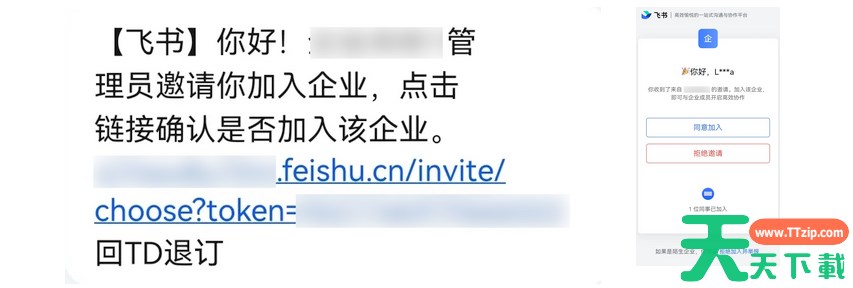注:如果拒绝加入企业,可选择 拒绝邀请。拒绝后,你将不会加入该企业,管理员在飞书管理后台所存储的手机号和姓名信息也将被删除。