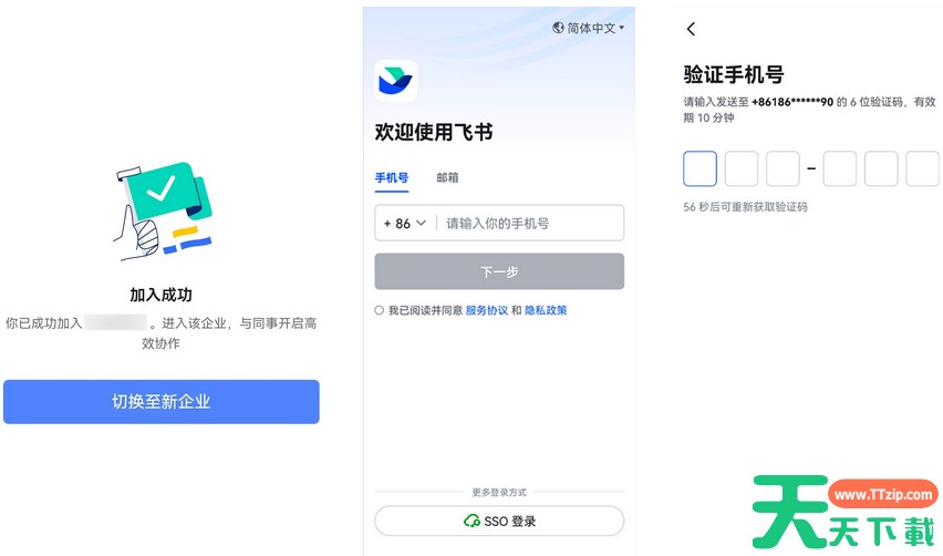 加入成功后,点击 切换至新企业,前往下载和安装飞书客户端。飞书客户端下载并安装完成后,打开客户端,输入收到邀请短信的手机号并完成验证,即可进入企业,在飞书与企业其他成员高效协作。
