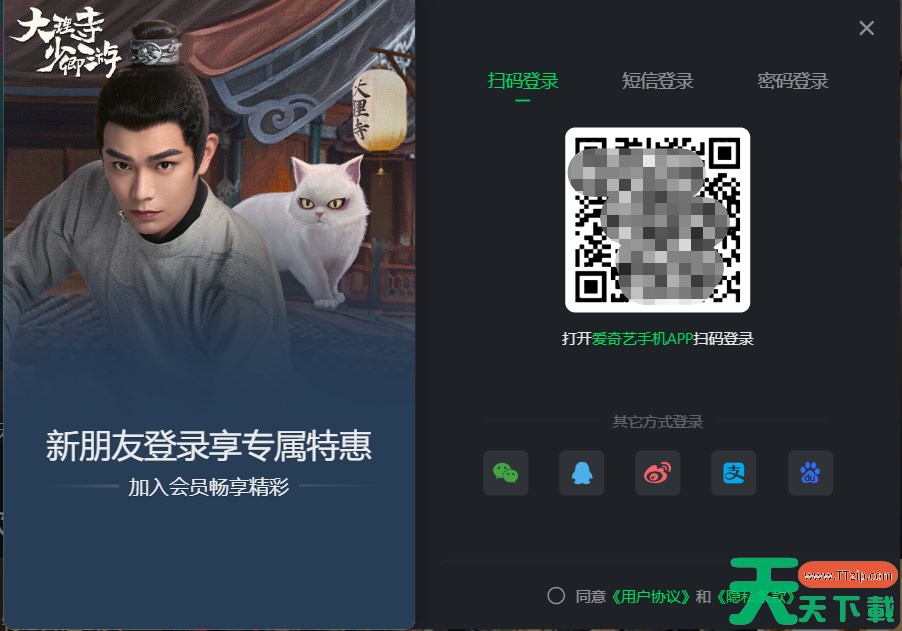 选择登录方式,如手机号、微信、QQ、密码等。