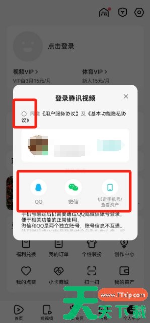 点击【点击登录】,勾选《用户服务协议》选择微信或QQ渠道登录即可。