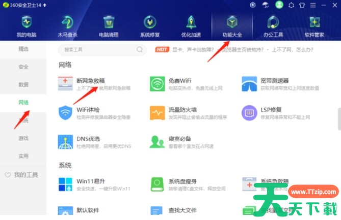 下载安装360安全卫士后,在页面上方找到“功能大全”点击就进入到到功能列表,左侧点击网络