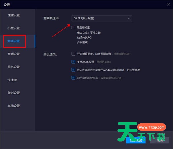 3、接着进入“游戏设置”,如果我们的配置不足,尽量调低游戏帧速率,一般设置“60FPS”就可以很流畅了。