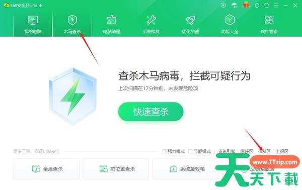 2、进入木马查杀界面后,点击【恢复区】;