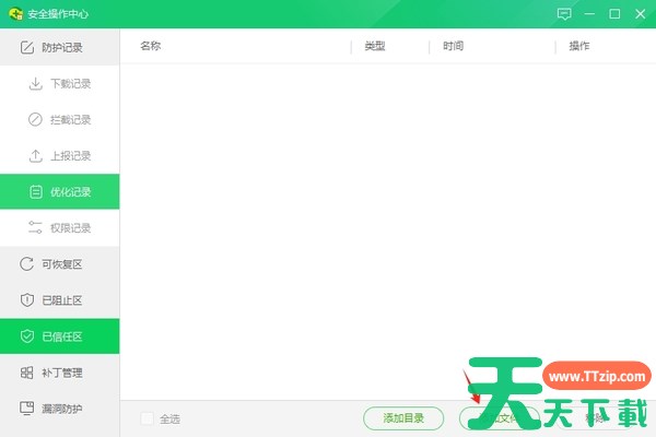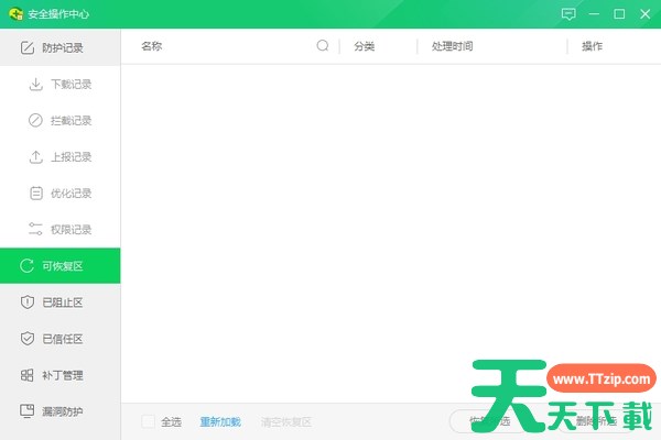3、如果我们有被拦截的内容,会在恢复区显示,此时点击【恢复】,并且确认即可(由于天天下载Ttzip的电脑中暂时没有被无故拦截的文件,故恢复区为空);