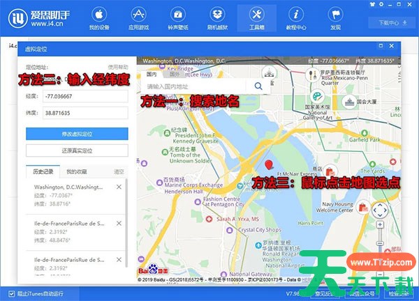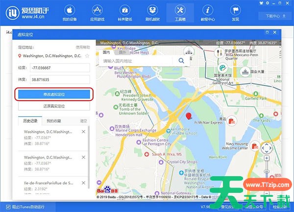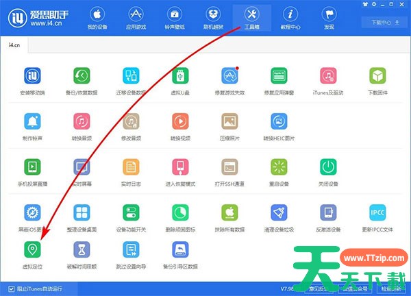 爱思助手的虚拟定位功能,可以将苹果设备定位到任意地点,足不出户就能让朋友圈、微博内容显示到想要的位置;如果某些游戏限制了使用区域,使用爱思助手虚拟定位也能轻松突破。具体怎么改虚拟位置呢,下面和天天下载Ttzip一起来看看吧!