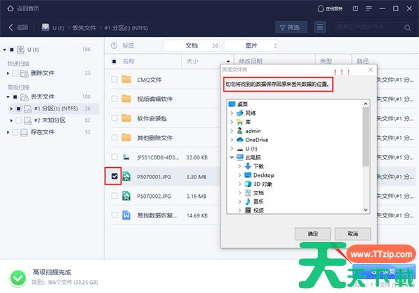 切记不可将数据保存回源盘,以免覆盖丢失数据,导致数据彻底无法恢复。