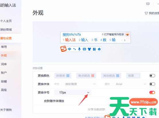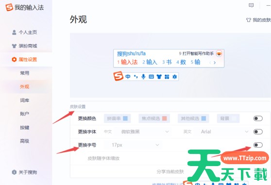 搜狗输入法的外观在这里都能设置,除了字号挚爱,还可以设置字体、颜色等,还可以点击右上角【我的皮肤】,设置一个好看的皮肤风格,搜狗输入法内置多种皮肤,大家可以下载体验。