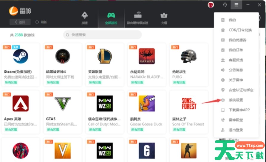 雷神加速器是一款兼容多平台、支持跨服务器、追求极致稳定加速服务的网络游戏加速器。那么雷神加速器怎么设置路径?雷神加速器设置路径的方法?下面就让天天下载Ttzip给大家解答下吧! 雷神加速器怎么设置路径? 1、点击右上角的三条杠“设置”按钮。 2、在下拉菜单点击“系统设置”。 3、在设置界面中,找到“游戏下载路径”选项,“选择路径”按钮,即可更改设置路径了。 以上就是天天下载Ttzip为您整理的雷神加速器怎么设置路径?雷神加速器设置路径的操作流程啦,希望能帮到您。 除特别注明外,本站所有文章均为 天天下载 原创,转载请注明出处来自 https://www.ttzip.com/211684.html