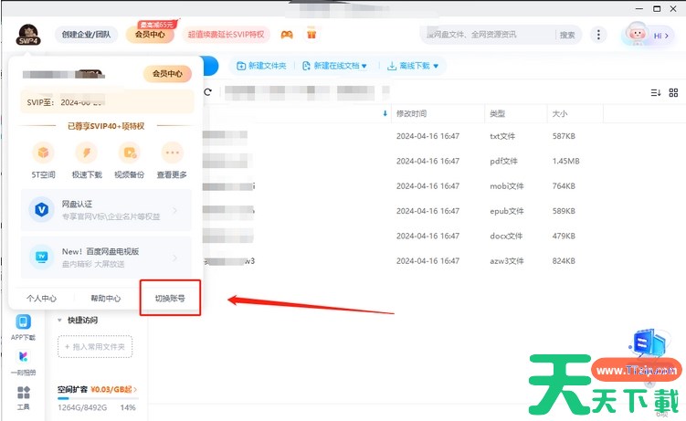 1、点击头像位置。 2、点击切换账号,便可以退出了。 以上就是百度网盘怎么退出账号的相关内容,希望对您有所帮助! 除特别注明外,本站所有文章均为 天天下载 原创,转载请注明出处来自 https://www.ttzip.com/211687.html
