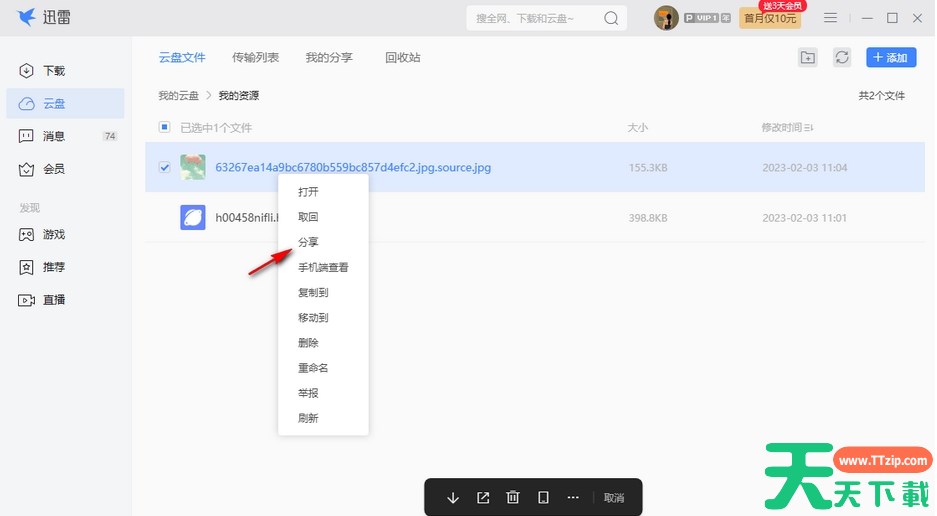 1.将电脑版的迅雷软件双击打开,然后在页面的左侧将【云盘】点击一下,在右侧页面找到自己想要分享的文件,将其右键点击选择【分享】。
