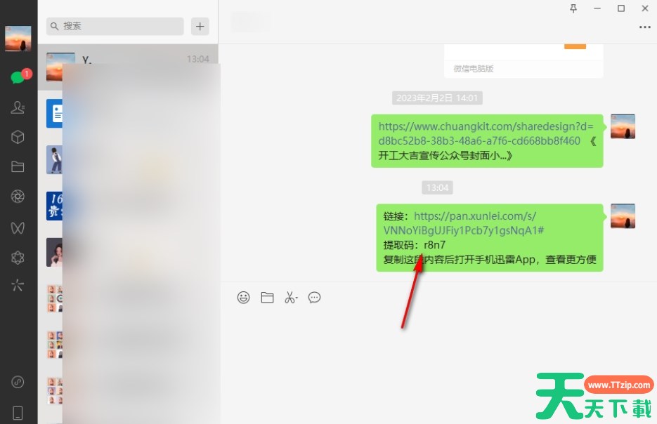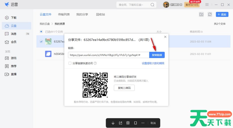 3.天天下载Ttzip这里选择复制链接,那么将链接发送给好友之后,好友可以通过链接点击进行查看。