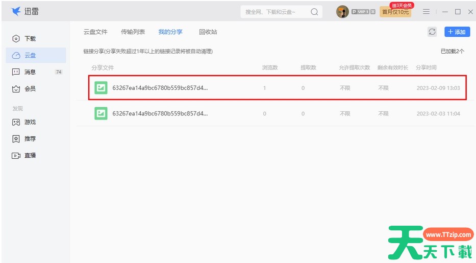 6.然后返回到迅雷的云盘的【我的分享】页面中,你可以查看到自己分享的文件信息,以及浏览数和提取数等。