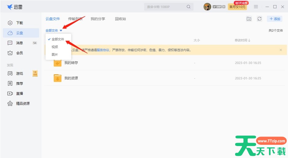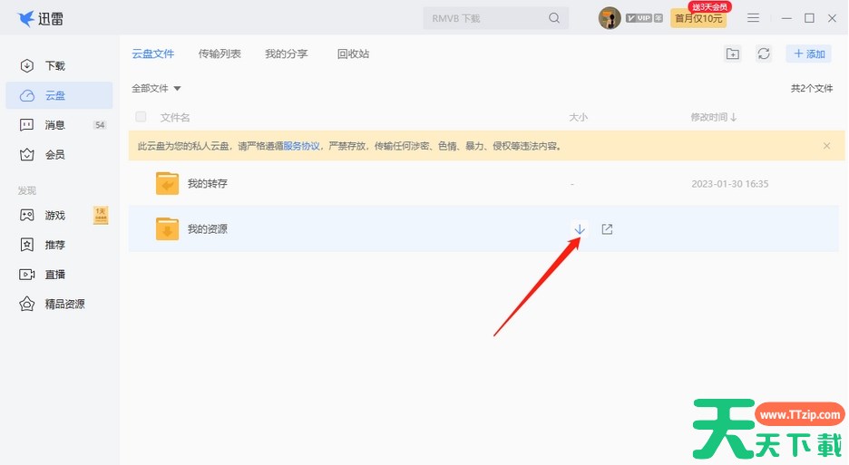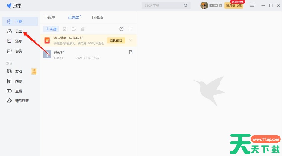 1.首先我们将电脑版的迅雷软件双击打开,然后在主页面中将左侧的【云盘】选项点击一下。