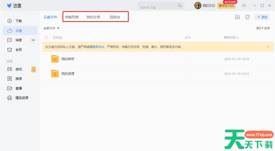 5.此外,在该页面的上方有【传输列表】【我的分享】【回收站】等几个选项,如果不小心将文件删除了,可以在回收站中进行查看与恢复。