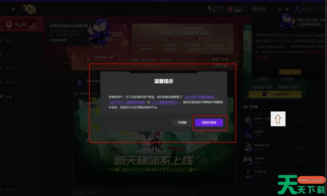 1,注册账号后,首次进入5E对战平台客户端,需阅读并同意相关的条款内容,不同意是无法使用平台的