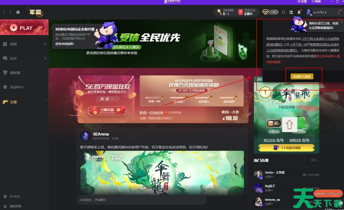 2,同意条款后>需查看客户端右上角弹窗内容>查看后点击“未成年人复核”即可进行实名认证了