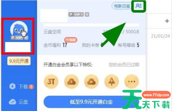 2、首先点击迅雷界面左侧的头像,然后在右边点击三横线。