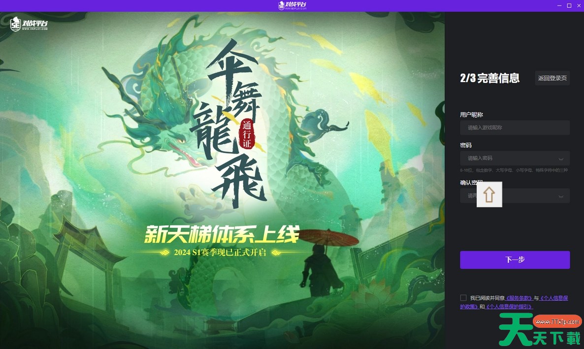 3,注册界面第二步>填写5E平台的用户名称(即游戏名)>设置账号的密码>二次填写确认密码>阅读并勾选下方的文件说明>点击“下一步”即可