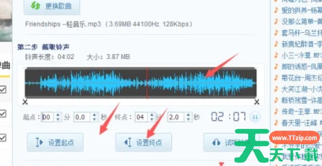 将音频文件置入后,您可以在铃声制作面板中看到音频的波形图。此时,您可以使用鼠标拖动或输入具体的时间点来设定铃声的起始时间和结束时间。