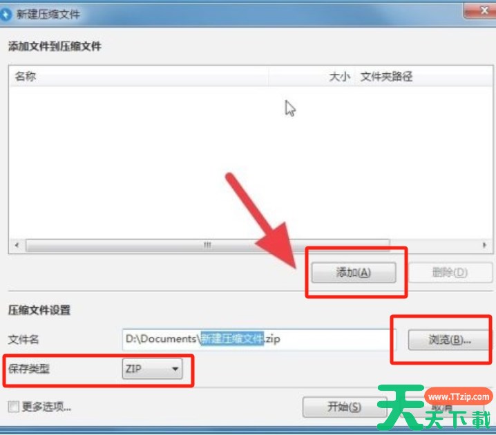 2、在新建压缩文件的页面中,点击“添加”按钮,找到并选择你想要压缩的文件,确定压缩文件的保存类型,点击“浏览”按钮进行设置。