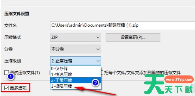 3、然后勾选左下角的【更多选项】,将【压缩级别】的下拉按钮点击打开,在下拉菜单中选择【极限压缩】。