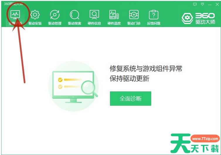 1、打开360驱动大师,然后在首页点击全面诊断,就能把我们异常的驱动程序检测出来。