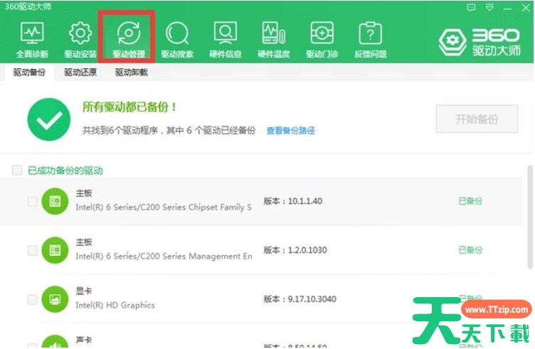 3、在更新完打印机驱动后,点击上方的驱动管理,对已经安装好的驱动进行备份,然后点击开始备份即可。