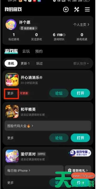 2、然后在我的游戏的页面中可以看到已下载的游戏,在这选好需要卸载的游戏后点击【更多】;