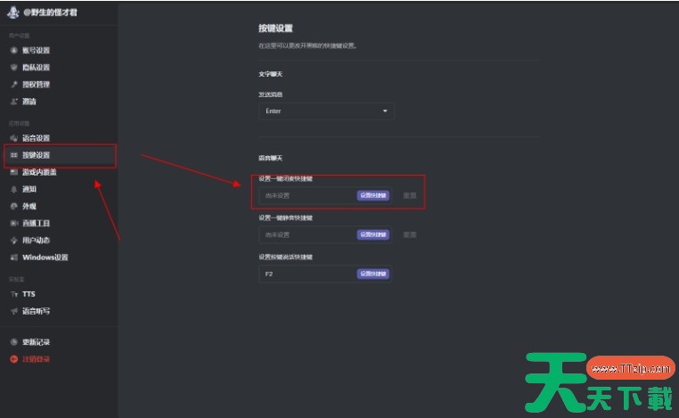 kook是一个好用的语音沟通工具,那么kook怎么一键闭麦?kook一键闭麦的操作流程?下面就让天天下载Ttzip给大家解答下吧! kook怎么一键闭麦? 1、打开kook软件,在软件界面的左上角,找到并点击你的头像,进入用户设置。 2、在用户设置界面中,找到并点击“按键设置”选项。 3、在按键设置界面中,在“设置一键闭麦快捷键”的选项中设置快捷键。 4、设置成功后就可以通过快捷键一键闭麦了。 以上就是天天下载Ttzip为您整理的kook怎么一键闭麦?kook一键闭麦的操作流程啦,希望能帮到您。 除特别注明外,本站所有文章均为 天天下载 原创,转载请注明出处来自 https://www.ttzip.com/211810.html