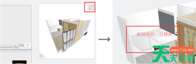 此时,已经创建了一块大小为4791×4360mm的楼板,但在墙面编辑中是看不到三维效果的,需要点击下列左侧图中红框内所示的按钮到3D视图查看。