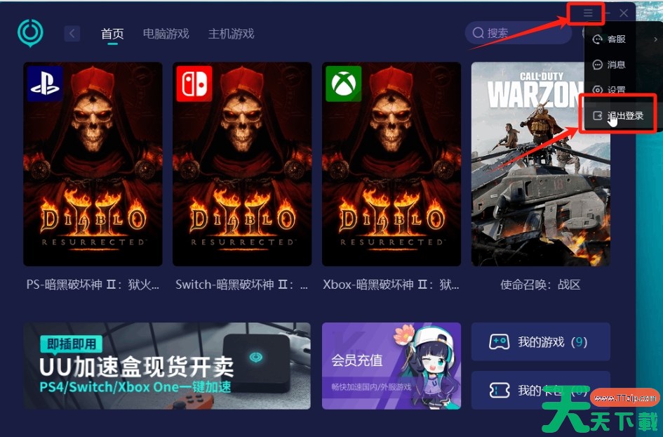 UU加速器是一款致力于帮助游戏降低延迟、稳定不掉线、解决卡顿的游戏工具。那么UU加速器怎么退出登录?UU加速器退出登录的方法?下面就让天天下载Ttzip给大家解答下吧! UU加速器怎么退出登录? 1、打开UU加速器应用,点击右上方的“三条杠”设置按钮,在跳出的选项中选择“退出登录”按钮。 2、然后在跳出的页面中,点击“确定”即可退出。 以上就是天天下载Ttzip为您整理的UU加速器怎么退出登录?uu加速器退出登录的操作流程啦,希望能帮到您。 除特别注明外,本站所有文章均为 天天下载 原创,转载请注明出处来自 https://www.ttzip.com/211823.html
