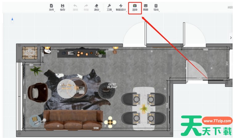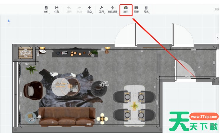 2、在室内设计装修方案界面中,找到界面最上方工具栏上的“渲染”功能,并点击。