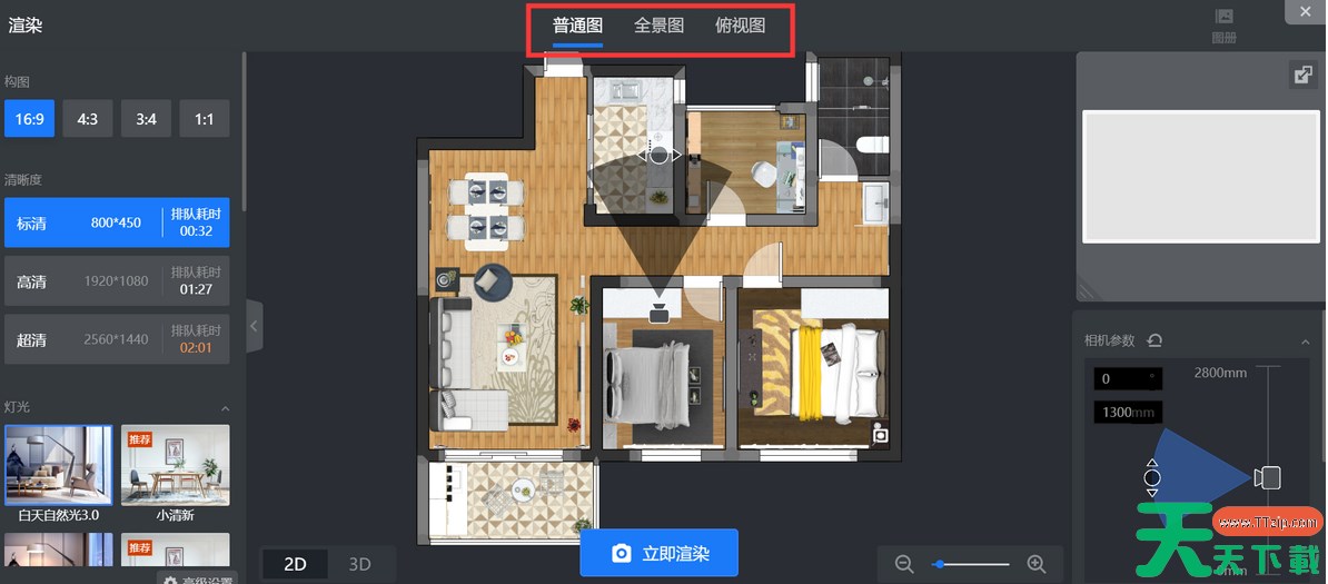 渲染界面的上方可以选择普通图、全景图、俯视图选择后就开始设置吧