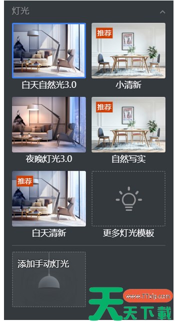 第3步,选择灯光模板,如果灯光模板达不到要求,也可以“添加手动灯光”目前,灯光模板已经适用于大多数场景,一般都可以满足要求哦,新手可以先使用灯光模板