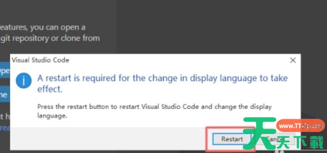 4、点击列表中的“Restart”按钮,重启 Vscode,就可以变成了中文。