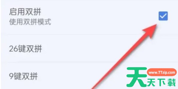 在“我的”页面点击右上角的小齿轮图标进入,然后选择“输入设置”,再点击“双拼输入”,最后在“启用双拼”旁的小方框中打上勾,即可启用双拼输入形式。