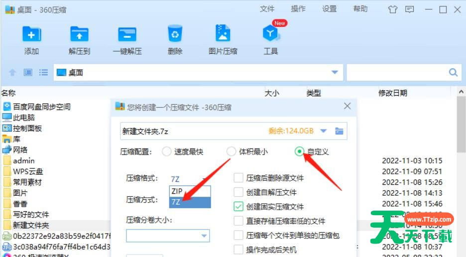 3.或者你可以勾选【自定义】,将下方的【压缩格式】选择为7z,因为一般7z的压缩力度会比较大,压缩出来的文件体积相对比较小一点。