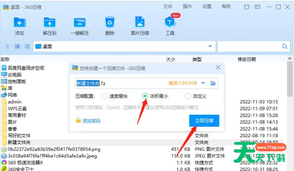 2.随后会弹出一个窗口,在该窗口中将【体积最小】勾选上,然后点击【立即压缩】按钮即可压缩。