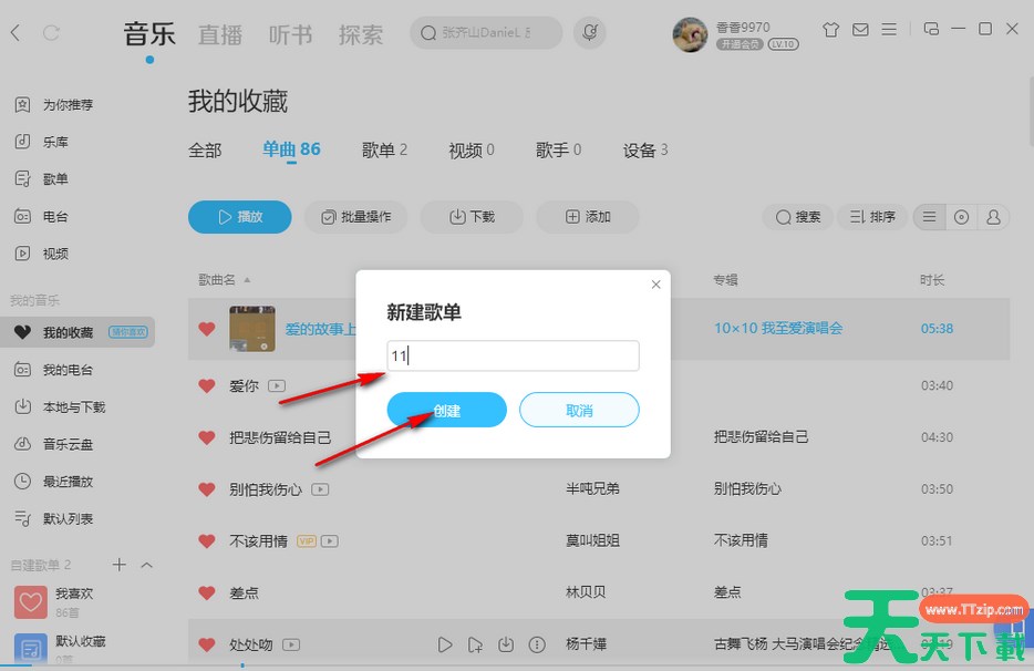 4.随后就会打开一个窗口,在框中输入歌单的名字,然后点击创建。