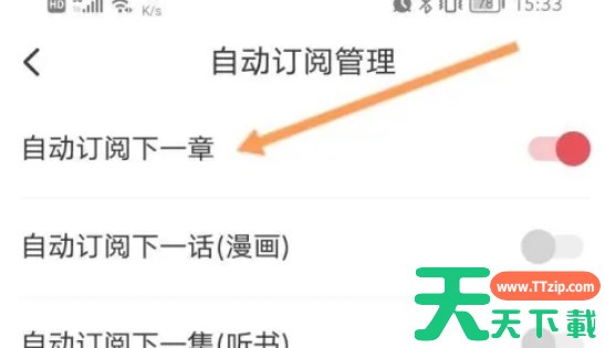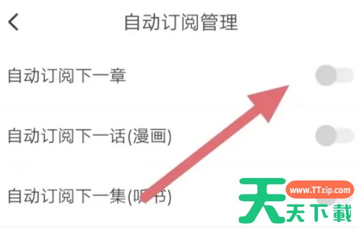 在“自动订阅管理”页面,您会看到与自动订阅相关的各种设置。其中一个具体的设置是“自动订阅下一章”,当前允许应用在用户阅读完当前章节后自动下载或显示下一章节的内容。