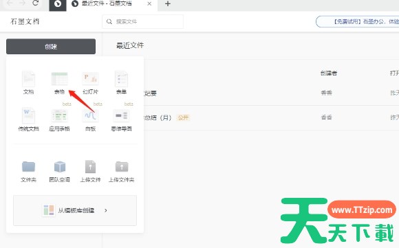 打开石墨文档软件。点击左上角的【创建】按钮。选择【表格】来创建一个新的表格。