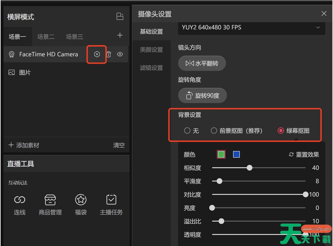 在摄像头设置中新添加了人像抠图的功能,包括绿幕抠图、前景抠图
