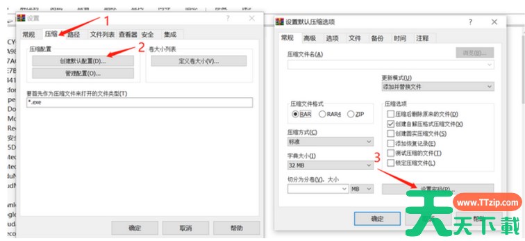 打开WinRAR,点击选项 – 设置 设置界面中,切换到【压缩】,点击 创建默认配置 – 设置密码 以上就是关于WinRAR怎么设置解压密码的相关内容,希望对您有所帮助! 除特别注明外,本站所有文章均为 天天下载 原创,转载请注明出处来自 https://www.ttzip.com/211932.html