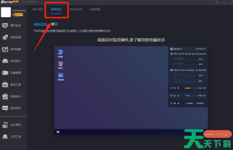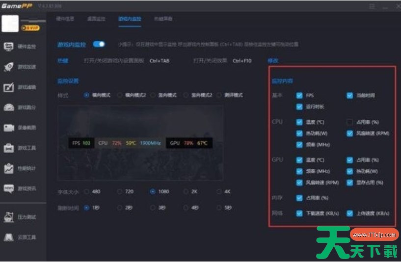 游戏加加软件支持在游戏中监测并显示硬件性能和时间,还具有截图、屏蔽热键释放内存等功能。那么游戏加加怎么显示帧数?游戏加加显示帧数的方法?下面就让天天下载Ttzip给大家解答下吧! 游戏加加怎么显示帧数? 1、打开游戏加加软件,点击左侧栏的“硬件监控”。 2、切换至“桌面监控”设置页,开启桌面监控。 3、接下来,切换至游戏加加的游戏内监控的设置页,将游戏内监控开启。 4、在游戏内监控的“监控内容”中,勾选“FPS”选项。 5、进入游戏,便会发现游戏加加在游戏中成功显示帧数。 以上就是天天下载Ttzip为您整理的游戏加加怎么显示帧数?游戏加加显示帧数的操作流程啦,希望能帮到您。 除特别注明外,本站所有文章均为 天天下载 原创,转载请注明出处来自 https://www.ttzip.com/211954.html
