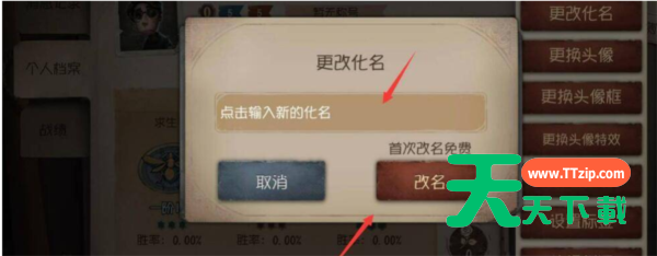 4、最后玩家在输入框输入自己想要改的昵称就可以了,第一次是免费的,后面改就需要改名卡了。